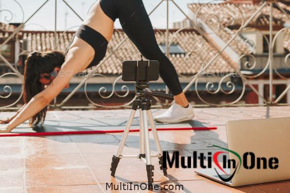 PhotoDune – Young sporty fit woman coach doing online lessons through video call on her mobile phone
